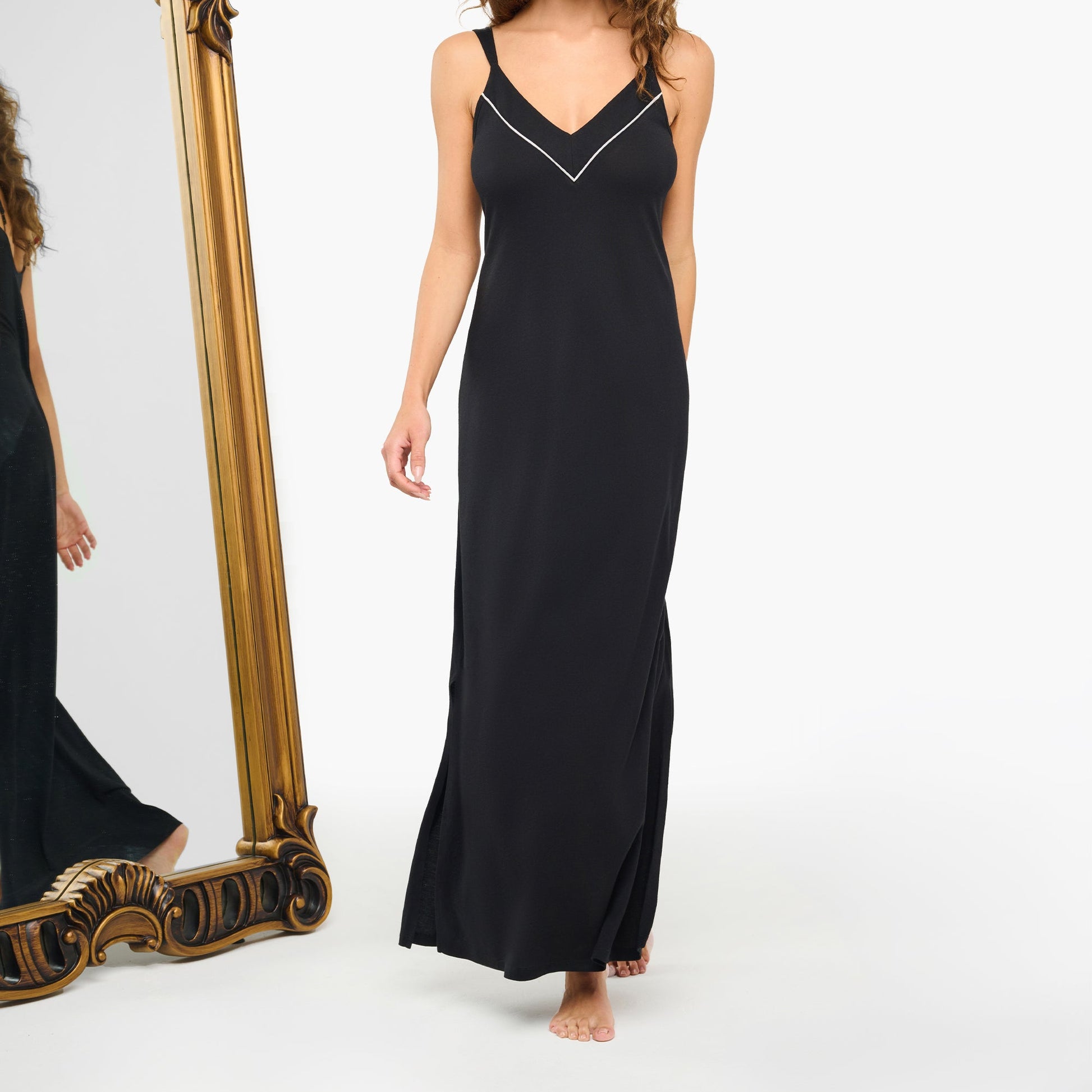 Welcome to everyday comfort. This new collection uses sustainable, soft Pima cotton and modal jersey. The Pima Lusso Maxi Dress features side slits and a minimal silhouette, making it perfect for cozy nights and lazy mornings.